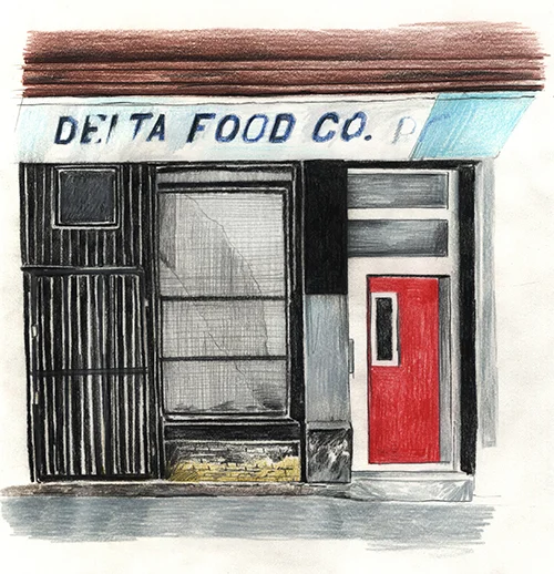 Personal work - drawings of shop fronts, buildings and urban decay.